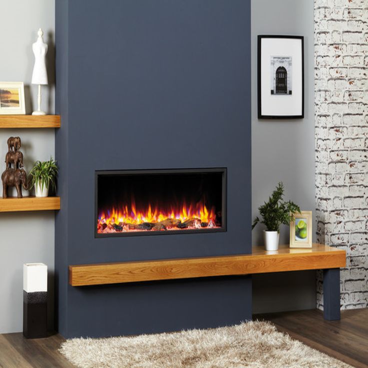 The modern slate blue wall with a recessed electric fireplace offers a wood ledge and offset shelf. You can choose any color or texture for a featured wall, including bold paint colors, brick, stone, shiplap reclaimed wood, or virtually any other wall finish you can imagine.