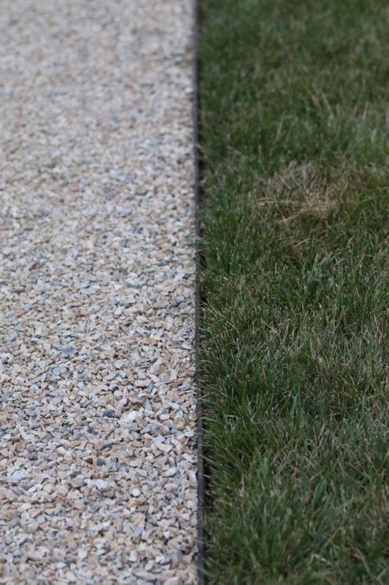 Having grass or lawn come right up the driveway edge is an affordable solution but may require more work to keep the gravel nicely contained. There’s less of a barrier stopping the gravel from washing away when it rains, so it’s important to rake your driveway often and keep the grass edge well-trimmed if you decide to go this route.
